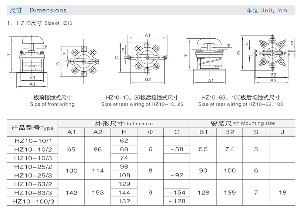 A HZ10-M légmentes típusú kombinált bütykös kapcsoló 10A AC 50 Hz-ig, 380 VAC-ig és 220 VDC-ig, 10A névleges árammal. Támogatja a kézi, ritka kapcsolást, megszakítást és átalakítást rezisztív és rezisztív-induktív vegyes terhelésekhez, és vezérli a kis kapacitású váltakozó áramú motorokat.